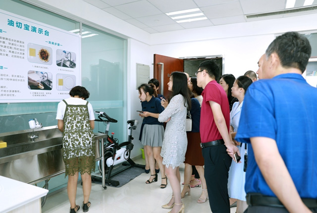 专家团一同参观了木齐的油切洗涤演示台。通过现场工作人员演示油切水快速去除油污的清洁效果,专家团成员纷纷表达对传统洗涤产业的突破,以及物理洗涤技术的赞赏。 |